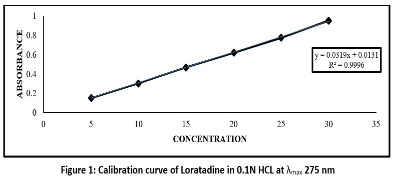 10 mg of Loratadine, precisely measured, were dissolving in ten milliliters of filtered water and 10 ml of 0.1N HCL, separately, in a vial. After that, these solutions were allowed to remain for an entire day at room temperature on a magnetic stirrer. Whatman filter paper was used to filter the samples after the specified period of time, and the filtrates were analysed for absorbance.