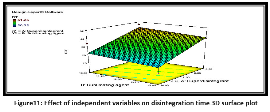 Figure 11: Effect of independent variables on disintegration time 3D surface plotClick here to view figure
