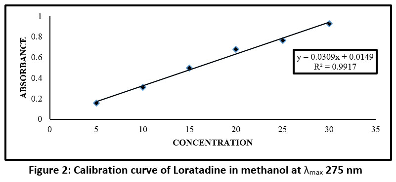After precisely weighing 10 mg of Loratadine, the level of volume was increased to 100 mL with methanol to generate a standard stock solution with a concentration of 100 μg/mL. With a concentration and a working standard solution of 10 μg/mL was obtained by using 1 mL of this standard stock mixture and diluting it out with methanol to a final volume of 10 mL.