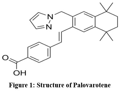 Desired amount 25 mg of palovarotene was measured and taken in a 25 ml VF, after adding 15 ml of methanol to the flask was shaken, sonicate it for 15 minutes. After shaking the flask, diluent was added to make it up to par. A nylon filter (0.45 μ) was used to filter the aforementioned solution. The sample solution was brought up to the mark with desired diluent solution to prepare a sample containing 20 μg/ml of Palovarotene and assessed.