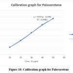 Palovarotene 25 mg was measured in 25 ml VF and mixed with CH3OH to prepare stock solution (1000μg/ml). By serially diluting this stock solution with methanol, several std solutions (10–60μg/ml) were enumerated. A nylon filter (0.45 μ) was used to filter the produced solution, and chromatographic analysis was performed to enumerate the calibration plot.