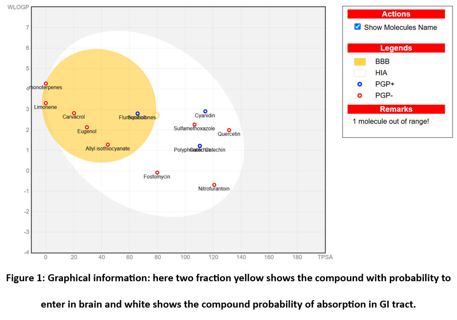 So, in our research we took isothiocyanate, Cyanidin, Quercetin, Limonene, Catechin, Carvacrol, Eugenol, oils, Polyphenolic Catechin and monoterpenes phytoconstituents of herbs which showed an uropathogenic activity in vitro to predict the druglikliness property. Then we also selected some random existing drug named Sulfamethoxazole, Nitrofurantoin, Fosfomycin, Fluroquinolones, and one potential chemical existing under review as antiviral, anticancer and also showing antibacterial property named Sunitinib as drug repurposing candidate to compare the pharmacokinetics  and druglikliness parameters against our phytoconstituents in order to find out the potentiality of our selected molecules to be drug molecules.