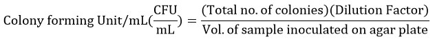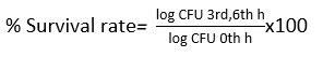 The typical bile concentration found in the human intestine is estimated to be 0.3% (w/v). The duration for which the food we consume remains in the small intestine is approximately 4 hours. Isolates were tested for their resistance to different stress factors. For bile tolerance, 1 mL of test culture (O.D at 600nm using UV-Spectroscopy model-PC based double beam Spectrophotometer 2206- Systonic) was transferred into a fresh broth of MRS media (added with 0.3% bile) which was diluted serially at every 0, 3 and 6 h and 100 µL was spread onto MRS agar plates. The method of plate count was used for observing and enumerating viable colonies, after incubation at 37±1°C for 48 h and expressed in log cfu/mL.17 Tests were performed in triplicate and the survival rate (%) was calculated as follows: