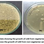 Figure 1: (a) MRS plate showing the growth of LAB from vegetarian samples whereas (b) shows the growth of LAB from non-vegetarian samples.