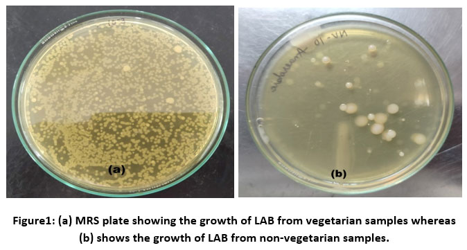 A total of 50 human faecal samples (24 each from healthy vegetarian and non-vegetarian diets respectively) were examined in this study. The results indicated a good growth of LAB on MRS agar plates. (Figure 1). A total of 120 colonies were successfully isolated under anaerobic conditions from the collected samples. Total 75 bacterial cultures were isolated from the vegetarian samples and only 45 from the non-vegetarian samples which clearly suggest higher quantity and greater diversity of microbiome in vegetarians. The identification of the isolates was conducted based on their physiological and biochemical characteristics. The identification was done on the basis of fermentation of sugar with the help of the Bergey’s Manual of Systematic Bacteriology. The Colony forming unit /mL varies from the range of 102 to 108 and was counted with the help of the colony counter. The traits of colonies developed on the MRS plates differed across the various samples. As the diet influences the growth of gut microbiota, the MRS plates spread with the vegetarian samples shows the high growth of the LAB isolates whereas the plates spread with the non-vegetarian stool sample having less count of colonies and the types of colonies on the spread plates were also decreased (Table 1).