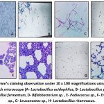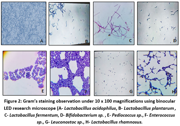 Figure 2: Gram’s staining observation under 10 x 100 magnifications using binocular LED research microscope (A- Lactobacillus acidophilus, B- Lactobacillus plantarum , C- Lactobacillus fermentum,
