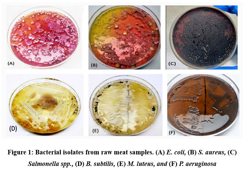 Foodborne diseases are a significant public health issue occurs due to high risk of bacterial contamination by several types of pathogens that contribute to high morbidity and mortality globally.6 Every year, approximately 600 million instances of foodborne diseases and 420,000 fatalities are caused by contaminated food across the world. Young children under the age of 5 staggering 40% of the global burden of foodborne diseases. According to the World Health Organization (WHO), consuming unsafe food leads to the loss of approximately 33 million healthy life years (DALYs) each year.7 Globally, bacterial pathogens commonly linked to meat include Salmonella spp., Bacillus spp., Lactobacillus spp., Staphylococcus aureus, Campylobacter jejuni, Listeria monocytogenes, Clostridium spp., Yersinia enterocolitica, Brucell, Mycobacterium bovis, Aeromonas hydrophila, Salmonella species, Campylobacter spp., and verocytotoxin-producing E. coli O157:H7 that lead to self-limiting gastroenteritis, more severe invasive diseases and pose significant public health concerns. Additionally, Pseudomonas species are known to contribute to meat spoilage, resulting in undesirable characteristics such as off-odors, off-flavors, discoloration, and gas production.8,9 Observations have indicated that during the processes of slaughter, dressing, and cutting, the primary source of bacteria are the animal’s exterior and digestive system. However, additional sources such as blades, clothes, the surrounding air, workers, carts, crates, and equipment also contribute to bacterial presence.10 The introduction of various species of organisms suggests that under typical conditions, a substantial number of potential spoilage organisms exist and can proliferate if favourable conditions manifest.11 Keeping in mind that hygiene practices remain poor along the meat production and utilization, the present study was done to determine the prevalence of foodborne pathogens with special emphasis on Escherichia coli (E. coli), Staphylococcus aureus (S. aureus), Salmonella spp., Bacillus subtilis (B. subtilis), Micrococcus luteus (M. luteus), and Pseudomonas aeruginosa (P. aeruginosa) in marketed raw meat available in different areas nearby Chandigarh (UT), India.