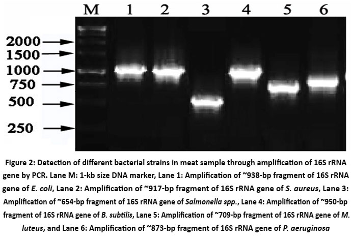 In this study, a bacterial infection Micrococcus luteus was found in ~20% of the meat samples. When grown on mannitol salt agar, colonies generally appeared unpigmented or cream-white, with circular, smooth, entire margin, and convex forms (Table 4; Figure 1). Micrococcus luteus tested positive for MR, VP, oxidase, nitrate, and catalase in biochemical tests (Table 5). The 16S rRNA gene from Micrococcus luteus was further amplified and sequenced, producing an amplicon of about 750 bp (Figure 2). The obtained sequence was compared using the BLAST program with reference nucleotide sequences available on NCBI, providing clear evidence that Micrococcus luteus were present in the meat samples.