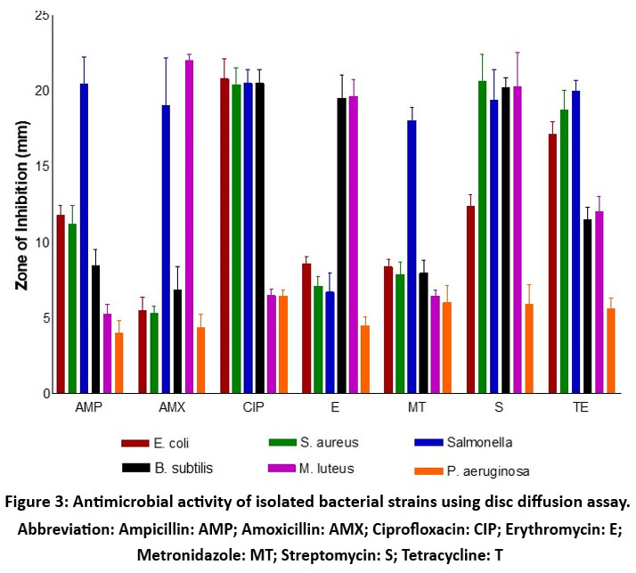 Figure 3: Antimicrobial activity of isolated bacterial strains using disc diffusion assay.Click here to view Figure
