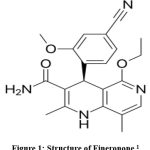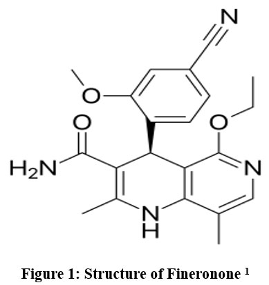 Finerenone ((4S)-4-(4-Cyano-2-methoxyphenyl)-5-ethoxy-2,8-dimethyl-1,4-dihydro-1,6-naphthyridine-3-carboxamide), C21H22N4O3, having MW 378.432 g·mol−1.1,2 (Chemical structure shown in figure 1) is a non-steroidal mineralocorticoid receptor antagonist.3,4 Finerenone is prescribed to mitigate the risk of persistent reduction in glomerular filtration rate, end-stage renal disease, cardiovascular mortality, and hospitalization due to heart failure in individuals with chronic renal disease linked to type II diabetes mellitus.5,6