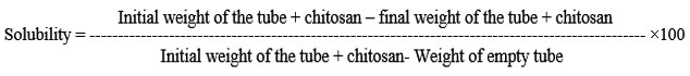 To evaluate the samples solubility test by dissolving 0.1 g of produced chitosan was dissolved in 10 ml of 1% acetic acid in triplicates in centrifuge tube of known weight 19. This was incubated in a shaker incubator at 25° C at 240 ×g for 30 min. The mixture was then centrifuged at 500×g for 10 min after being heated for 10 min in a boiling water bath and cooled to 25˚C. The supernatant was discarded and the undissolved particles washed in 25 ml of distilled water. The remaining particles were dried in an oven and the mass of the particle is weighed and the solubility was calculated using the formula 1