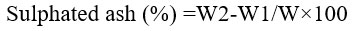 One gram of the sample was taken in a crucible that was weighed in an order to determine the inorganics in the sample in accordance with the Brazilian Pharmacopeia20. One millilitre of strong sulphuric acid added to wet the sample and then heated slowly until it charred. After cooling the sample, 1 ml of strong sulphuric acid was added to the sample in the crucible and heated at 600˚ C and kept there until the sample is completely ignited. The crucible was weighed after cooling in a desiccator. Until the constant weight gained, the cycle of heating and cooling repeated. The contents of sulphated ash are calculated as,