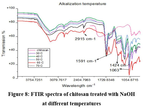 Figure 8: FTIR spectra of chitosan treated with NaOH at different temperatures. |