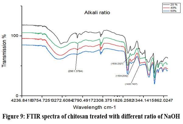 Figure 9: FTIR spectra of chitosan treated with different ratio of NaOH. |