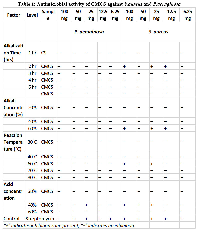 Table 1: Antimicrobial activity of CMCS against S.aureus and P.aeruginosa |