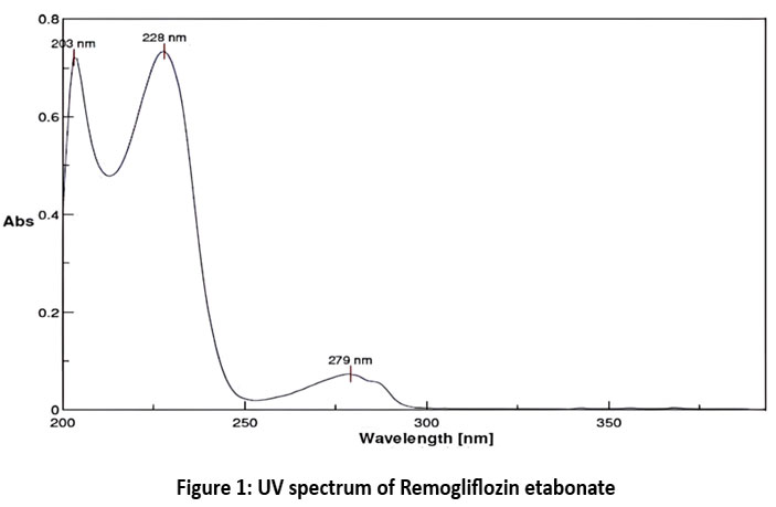 Further alteration of the mobile phase to Acetonitrile: Water (75:25 v/v) yielded a highly symmetrical and sharp peak for Remogliflozin etabonate, having 2.5 minutes as a retention time.. This trial demonstrated superior chromatographic performance, including rapid elution, a stable baseline, and a high signal-to-noise ratio. No interference was observed, confirming the specificity of the method. Table 1 outlines the optimised conditions.