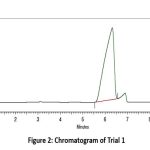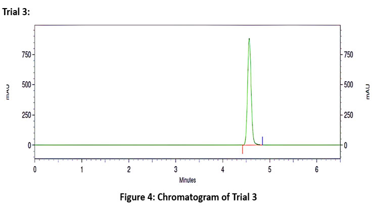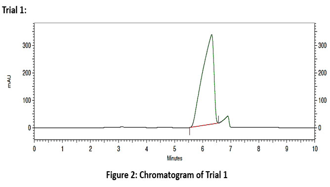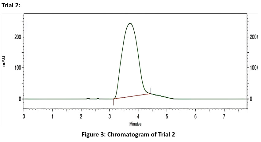 In Trial 1, the chromatogram obtained using Methanol: Water (70:30 v/v) displayed a broad and asymmetric peak with significant tailing at approximately 6 minutes. The inadequate peak shape, poor resolution, and high retention time indicated that the chromatographic conditions were suboptimal for Remogliflozin etabonate. Consequently, this trial was deemed unsuitable, and further optimization of the mobile phase and detection parameters was pursued in subsequent trials.