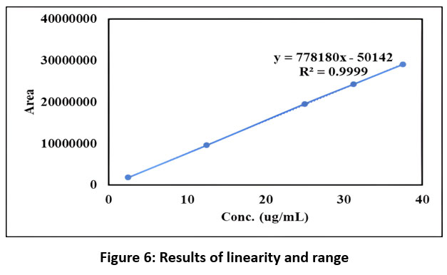 As presented in Figure 6, the calibration curve of peak area versus concentration showed outstanding linearity, with an r² value of 0.9999, validating the proportional relationship between analyte concentration and detector response.