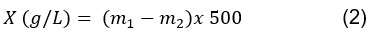 Biomass concentration was determined by the dry weight method. Samples of 2.0 mL of fermentation broth were transferred to centrifuge tubes and spun at 15,000 × g for 15 minutes. The supernatant was removed, and the tubes containing the wet biomass were dried in a convection oven (TE-394/I, Tecnal, Brazil) at 70°C for 24 h.19 Biomass concentration (X) was estimated using Equation 2: