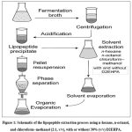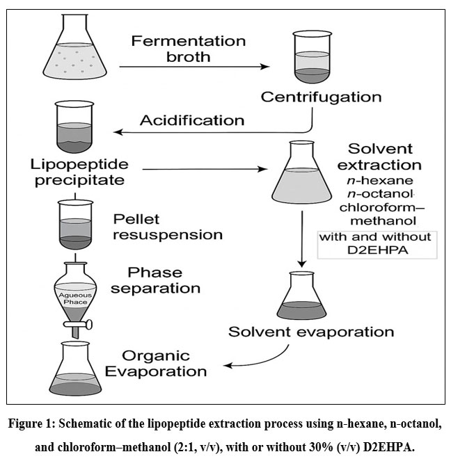 Figure 1: Schematic of the lipopeptide extraction process using n-hexane, n-octanol, and chloroform–methanol (2:1, v/v), with or without 30% (v/v) D2EHPA. |