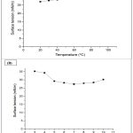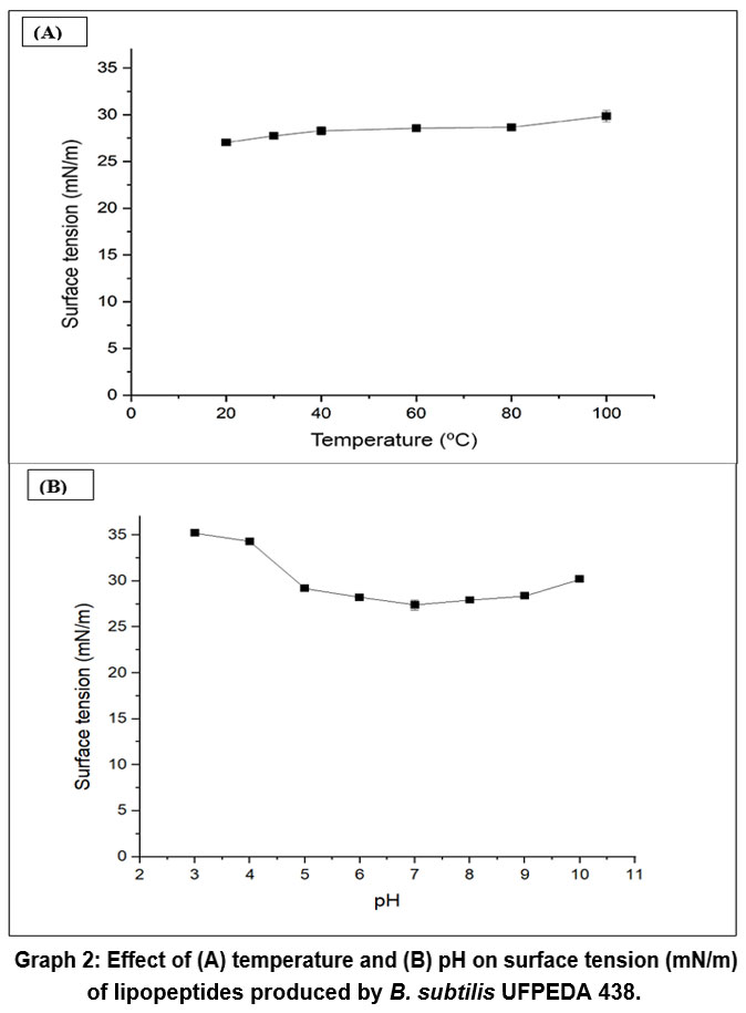 Graph 2: Effect of (A) temperature and (B) pH on surface tension (mN/m) of lipopeptides produced by B. subtilis UFPEDA 438. |