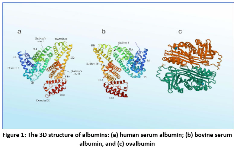 Animal, vegetable, or human sources are the main sources of albumin, which is easily supplied commercially. Egg white (OVA), BSA, and HSA are a few common types of albumin. These three forms of albumin have been widely used in research as well as in the food sector. Because of its inexpensive cost and simple purification procedure, BSA is frequently employed in research. Bovine spongiform encephalopathy is one of the losses from animal serum albumin that is commonly prevented using HSA. OVA is commonly utilized in the food sector for its ability to create foam and gel networks.[12] BSA and HSA, with a 76% sequence identity, share similar structures, conformation, and traits. The key difference lies in the placement of the tryptophan (Trp) residue. HSA has one Trp at position 214, while BSA has Trp-212 in subdomain IIA and an exposed Trp-134 in subdomain IB.21