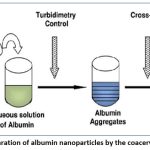 In the desolvation process, an aqueous solution of BSA(bovine serum albumin) is continuously stirred while organic solvents such as ethanol or methanol are added dropwise until the solution turns turbid. BSA has a high-water solubility; therefore, when an organic solvent is added, its phases will separate. Once the nanoparticles have adequately formed, they will stabilize and subsequently dissolve again in the aqueous solution.29 The process of coalescing and solidifying through a condensation reaction involves the aldehyde part of glutaraldehyde, the amino components in lysine residues, and the arginine parts in the guanidino side chain of albumin, resulting in the formation of the cross-linking. In 1978, Marty and his coworkers presented a new method. This technique entails gradually introducing an organic solvent, like methanol, ethanol, or regular salts, to the protein structure to produce a desolvation effect. This component will cause a change in the third protein structure. Once we reach a particular degree of desolvation, a protein cluster forms. This polymerization cluster cross-linked with a glutaraldehyde manufacturing factor will result in nanoparticles in the next stage. We should halt the framework before particles start to accumulate with the particular purpose of obtaining scattered nanoparticles, not in a bulk frame. This desolvation factor will lead to an expansion in framework turbidity estimation. Aggregation of particles will form independently with increasing background turbidity. We should use a resolving agent to prevent this kind of accumulation and create an ideal nano dispersion.30 The process of creating albumin nanoparticles employing a desolvating chemical is depicted in Figure 3.