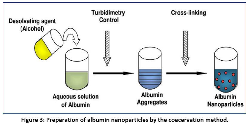 Several macromolecules are typically utilized to create nanoparticles; these primarily include proteins, such as gelatin, albumin, legumin, and vicillin, and polysaccharides, such as alginate or agarose. Due to their inherent qualities—such as biodegradability and biocompatibility—these materials are widely used in the arrangement of biomaterials. Of the macromolecules mentioned, gelatin and albumin have been used. For the creation of nanoparticles, there are two fundamental methods [31]. After rapidly mixing the oil phase (like cottonseed oil) with the albumin beads, the albumin nanospheres (0.3–1 μm) were created. The oil was heated to 175 to 180 °C for 10 minutes to achieve thermal balance. This blend was cooled and thinned with ethyl ether to help with centrifugation-induced separation. On the other hand, egg whites were mixed with cottonseed oil at 25 °C to create an emulsion in compound adjustment, before being denatured by being recombined with ether containing formaldehyde or 2,3-butadiene. Cefamandole nafate-stacked BSA nanoparticles were arranged by Crisante et al. using glutaraldehyde crosslinking without the use of a single emulsion agent. A constant phase consisting of cyclohexane with glutaraldehyde was mixed with the BSA fluid stage dropwise and homogenized quickly thereafter. Yang et al. created BSA nanoparticles to encapsulate the poorly soluble 10 Hydroxycamptothecin (HCPT) to enhance its stability, particularly in its active lactone form. They accomplished this through the implementation of a corrective process involving warm emulsion reformulation. The warm adjustment was utilized instead of concoction crosslinking in a study where the w/o single emulsion was drip-fed into castor oil at 140±5 °C.32 The potential of merging w/o/w multiple emulsion-based ovalbumin nanoparticles was examined in mucosal immunizations. The presence of light indicators in the nanoparticles indicated their absorption and subsequent internal movement within macrophage cell populations.