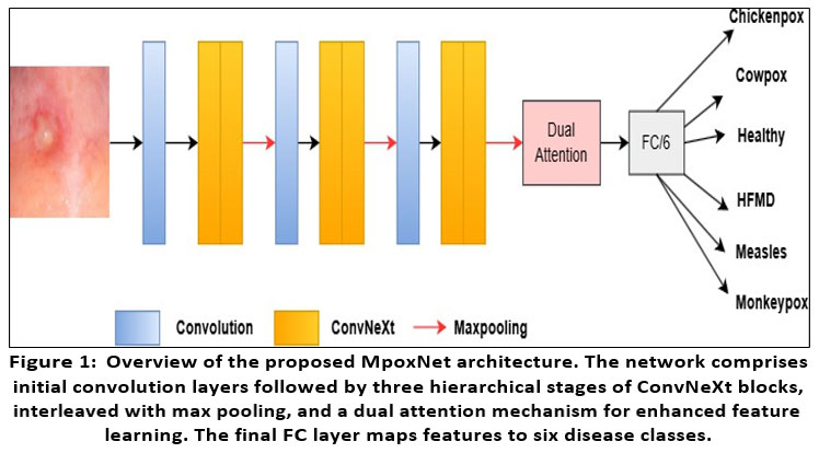 We present MpoxNet, a compact and computationally efficient convolutional neural network tailored for the classification of skin lesions caused by emerging infectious dis- eases. Unlike conventional CNN architectures, MpoxNet leverages ConvNeXt blocks to jointly capture local and global visual patterns. It also incorporates hierarchical pooling to integrate multi-scale contextual features and employs a dual attention mech- anism (channel and spatial) to enhance feature relevance. An overview of the MpoxNet architecture is illustrated in Fig. 1. The following subsections detail each architectural module of MpoxNet.