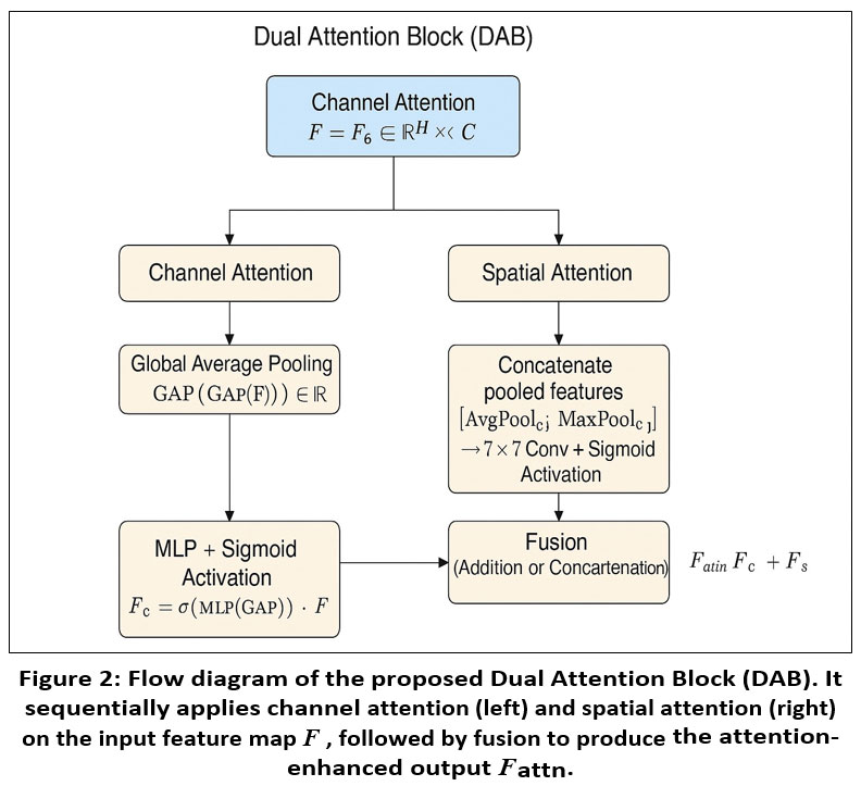 To enhance the discriminative capacity of the extracted features, we introduce a Dual Attention Block (DAB) that sequentially applies channel-wise and spatial attention mechanisms. This block is designed to selectively emphasize informative features across both the channel and spatial dimensions. The architectural flow of DAB is illustrated in Figure 2.