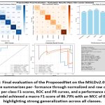 Finally, the performance summary panel (bottom-right) consolidates key clas- sification metrics, confirming the model’s overall accuracy (86.49%) and balanced performance across metrics like macro F1 (86.70%), weighted F1 (86.42%), and Matthews Correlation Coefficient (82.76%). The standard deviation of the F1-score (0.0671) indicates consistent per-class prediction strength. Together with 74 Grad- CAM heatmaps generated for interpretability, this visualization suite provides not only statistical performance but also diagnostic explainability, making MpoxN