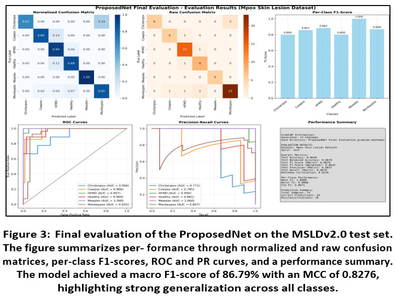 ABSTRACT:We propose MpoxNet, a lightweight convolutional neural network for the multi- class classification of skin lesions associated with emerging infectious diseases. Built on six ConvNeXt blocks and a Dual Attention Block that jointly models spatial saliency and channel dependencies, MpoxNet enhances discriminative fea- ture learning while maintaining computational efficiency. The model is evaluated on the Mpox Skin Lesion Dataset Version 2.0 (755 images across six clinically annotated classes), achieving a test accuracy of 86.49%, a macro F1-score of 86.79%, and a Matthews Correlation Coefficient of 82.76%. Grad-CAM visual- izations confirm that MpoxNet focuses on pathologically meaningful regions such as umbilicated lesion centers (Monkeypox) or maculopapular spread (Measles), supporting clinical interpretability. In addition, cross-dataset experiments on BreastMNIST, OCTMNIST, and OrganAMNIST demonstrate strong generaliza- tion capability. These results indicate that MpoxNet provides a computationally efficient, interpretable, and robust diagnostic tool suitable for deployment in resource-constrained clinical and public health settings.