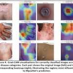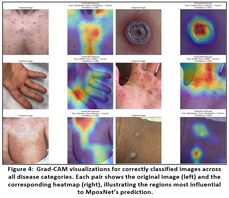To understand MpoxNet’s decision-making process, we utilize Gradient-weighted Class Activation Mapping (Grad-CAM) to visualize the discriminative regions contribut- ing to each prediction.11 Figure 4 showcases original lesion images alongside their corresponding Grad-CAM heatmaps for correctly predicted cases across six disease categories: Chickenpox, Cowpox, HFMD, Measles, Monkeypox, and Healthy skin. These attention maps reveal that the model consistently attends to pathologically meaning- ful features. For instance, in Chickenpox and Cowpox cases, MpoxNet focuses sharply on vesicular and pustular lesions—core clinical hallmarks of poxvirus infections—while in Measles, the model highlights the diffuse rash across the torso, closely resembling how dermatologists examine maculopapular spread.