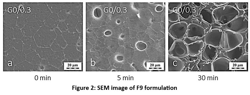 The spreadability of the produced hydrogel ranged from 17.69 ± 0.23 g/mm/sec to 25.50 ± 0.34 g/mm/sec. The findings revealed that prepared hydrogels can be easily dispersed using a minimal amount of shear. 31