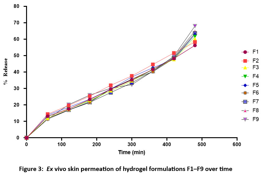 Spreadability was calculated using the slip and drag method, and the results are reported in Table 3. The spreadability of a hydrogel refers to its ease of application and ability to cover the skin area evenly. Formulation F9 had the maximum spreadability value of 26.8 g•cm/sec, indicating ideal viscosity and user approval. Other formulations have slightly reduced spreadability, either due to increased polymer content or inferior flow characteristics. 30
