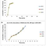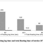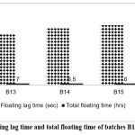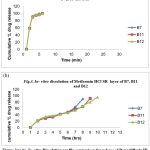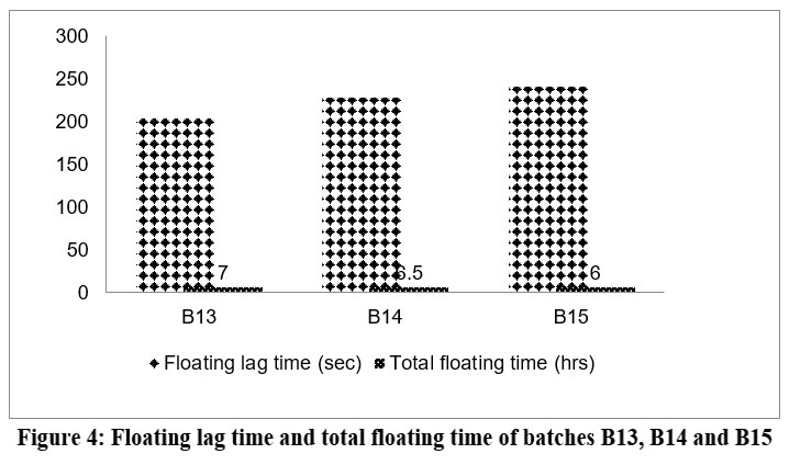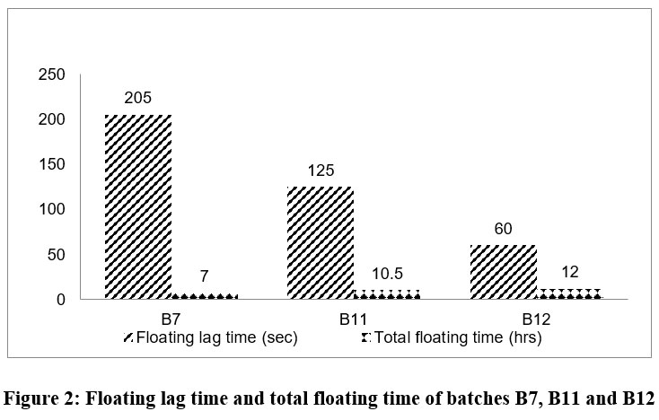 According to the data above, batch B7 and batch B11 had higher floating lag times because of lower gas producing agent concentrations. The lag time in batch B12 is floating within the specified bounds. Therefore, the floating lag time decreases as the sodium bicarbonate concentration rises. For additional research, the 100 mg of sodium bicarbonate was optimized.  Gas is produced when the dose form comes into touch with the stomach’s acidic environment.