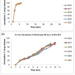 Release delaying agents have been included to the formulation in order to improve the delay in the drug release and to counteract the burst effect. The literature indicates that improved release rates are obtained when Carbopol 934P and Hypromellose are combined. Therefore, batches B16–B21 were created to examine how carbopol affected drug retardation.