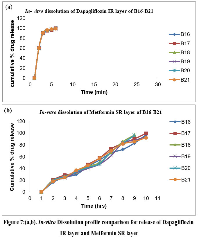 In addition to reducing floating lag time, the lower hardness (3 kg/cm2, 4 kg/cm2) also reduced total floating duration. Both the floating lag time and the total floating time increase with increasing hardness. Both the desired floating lag time and the total floating lag time are displayed by the batch with a hardness of 5 kg/cm2. The floating lag time and overall floating time are increased for batches with a hardness of 6 kg/cm2. For B17, a hardness of 5 kg/cm2 was therefore ideal. When the tablets come into touch with the gastric contents, the hydrocolloid particles’ compacted surface cannot hydrate quickly, which greatly reduces the tablet’s resistance to floating. Results from the optimized B17’s innovative in vitro release comparison were displayed in 24. With a 99.31% release rate at 12 hours, dapagliflozin exhibits superior release as compared to innovator.