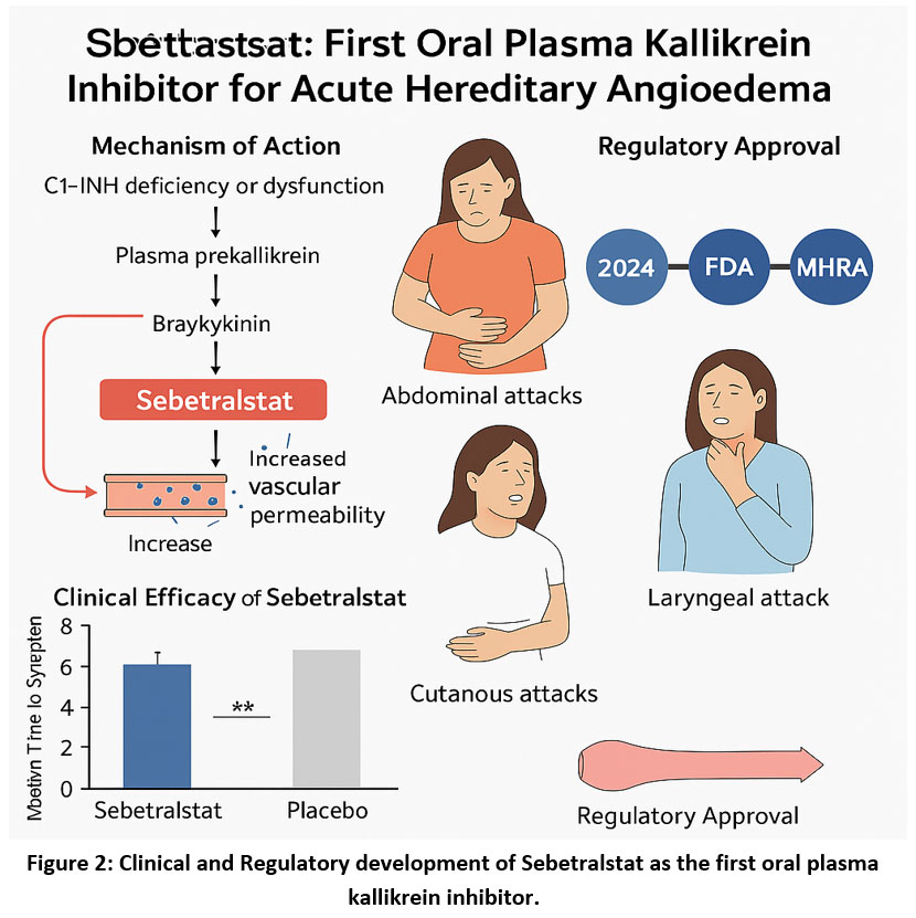 This review aligns with the journal’s focus on pharmacological innovation by critically evaluating the first oral plasma kallikrein inhibitor that transforms the treatment paradigm for hereditary angioedema. Beyond its mechanistic novelty, sebetralstat exemplifies how small-molecule design can substitute for injectable biologics, improving patient autonomy and adherence. The discussion further addresses regional and translational relevance, particularly for healthcare systems in low- and middle-income countries where self-administered oral therapies can substantially reduce dependence on infusion infrastructure, enhance treatment equity, and support cost-effective rare-disease management across Asia and similar resource-limited regions.