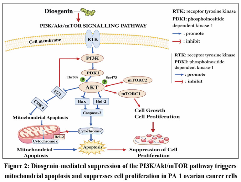 Figure 2: Diosgenin-mediated suppression of the PI3K/Akt/mTOR pathway triggers mitochondrial apoptosis and suppresses cell proliferation in PA-1 ovarian cancer cells