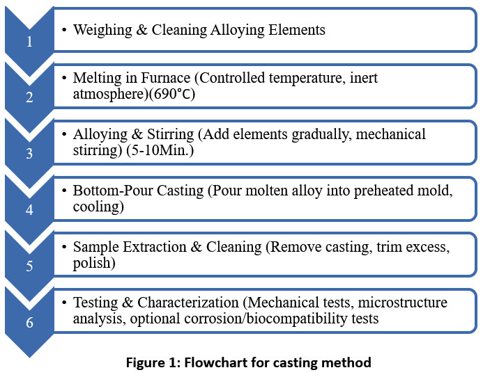 Several casting methods, such as gravity casting, vacuum casting, rotary centrifugal casting, squeeze casting, and extrusion casting, are available in an automatic bottom-pouring stir casting furnace intended for melting Mg, zinc, calcium, and Y metal alloys. Any metal with melting point less than 1000° C unlike conventional casting process, the melt pours from the bottom of this machine into the mould. Casting machine that allows mixing the alloying material in the base metal and pouring it into the mould with ease and without loss in the melt temperature. The Y concentration up to 12 wt.% was selected to evaluate its strengthening and corrosion resistance benefits in Mg-based alloys while remaining within ranges reported in biomedical studies. Previous research indicates that controlled Y addition improves microstructural stability and degradation behaviour; however, excessive release of Y³⁺ ions may cause cytotoxic effects and influence osteoblast activity. Therefore, this concentration range was chosen to identify an optimal balance between mechanical performance and biological safety (Witte et al., 2008; Myrissa et al., 2016; Rahman et al., 2020). Four distinct alloy samples were prepared with varying concentrations of Zn, Ca, and Y maximum acceptable limit of Y in body is 12% that’s why it can vary from 3-12% as detailed in Table 1.