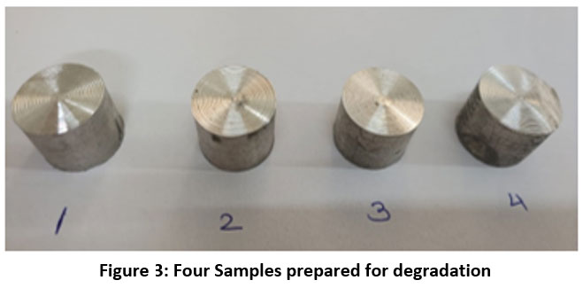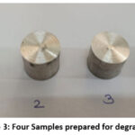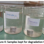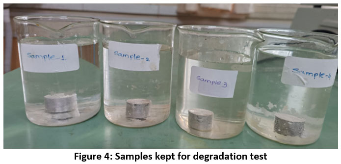 Four different samples are put in different four beakers. Hank’s solution is filled in all the four beakers. Ensure that sample is completely dipped in the solution. The samples of test and degradation are shown in Figure 3 and 4.