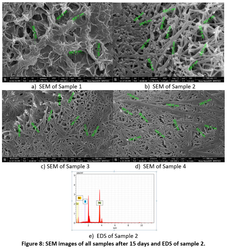 Figure 8: SEM images of all samples after 15 days and EDS of sample 2