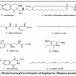 Levodopa consisted of a catechol-substituted aromatic ring linked to an amino acid side chain, and it was recorded in DrugBank under the ID DB00173. Lecithin (phosphatidylcholine) was identified as a glycerophospholipid composed of a glycerol backbone esterified with long-chain fatty acids and a choline phosphate head group,23 and it was listed in DrugBank with the ID DB00163. Glutathione was characterized as a tripeptide composed of glutamic acid, cysteine,20 and glycine containing a reactive thiol group, and its DrugBank identification number was DB00143. Oleic acid was observed as a monounsaturated long-chain fatty acid with a cis double bond and a terminal carboxylic acid group, and it was registered in DrugBank as DB00125. Tyrosine was described as an aromatic amino acid bearing a phenolic hydroxyl group attached to a benzene ring, and its DrugBank ID was DB00159. Valine was found to be a branched-chain aliphatic amino acid with an isopropyl side chain,24 and it was indexed in DrugBank under the ID DB00165. Serotonin possessed an indole ring system with a hydroxyl group and an ethylamine side chain, and it was documented in DrugBank with the ID DB00260. Linoleic acid was identified as a polyunsaturated fatty acid containing two cis double bonds within an 18-carbon chain, and it was assigned the DrugBank ID DB00146. Phytochemical Constituents of Kapikachu (Mucuna pruriens (L.) DC.) and Ginkgo biloba were given in Figure 2(a) and Figure 2(b).