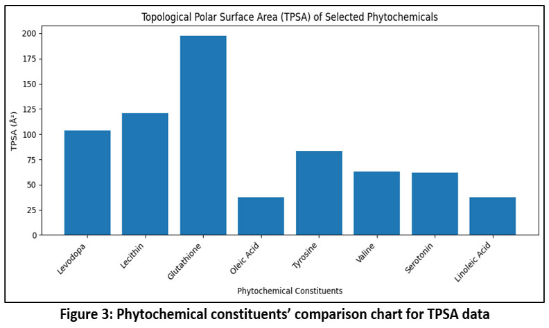 The physicochemical properties of the selected phytochemical constituents were compared based on hydrogen-bonding capacity, molecular refractivity (MR), topological polar surface area (TPSA), and lipophilicity descriptors. Levodopa exhibited a relatively high number of hydrogen bond acceptors (5) and donors (4) along with a moderate TPSA (103.78 Ų), indicating good polar interaction potential but low lipophilicity, as reflected by its negative tom-additive Calculated Logarithm of the Octanol/Water Partition Coefficient (−2.74). Glutathione showed the highest hydrogen-bonding capability with 7 acceptors and 5 donors and possessed the largest TPSA (197.62 Ų), suggesting strong hydrophilicity and limited membrane permeability. In contrast, Lecithin demonstrated a markedly higher molecular refractivity (218.47) and strong lipophilicity, with elevated intrinsic Logarithm of the Partition Coefficient (octanol/water) is (4.58) and tom-additive Calculated Logarithm of the Octanol/Water Partition Coefficient (13) values, indicating its bulky and highly hydrophobic nature. Oleic acid and linoleic acid displayed low TPSA values (37.3 Ų) and minimal hydrogen-bonding capacity, while their high lipophilicity suggested favorable membrane permeability but reduced aqueous solubility. Among the amino acids, tyrosine and valine showed moderate hydrogen-bonding properties and lower MR values, with negative XLOGP3 values indicating hydrophilic behavior. Serotonin exhibited balanced properties with moderate MR, TPSA, and lipophilicity, suggesting a favorable compromise between polarity and membrane permeability mentions in Table 1 and graph of TPSA in Figure 3.