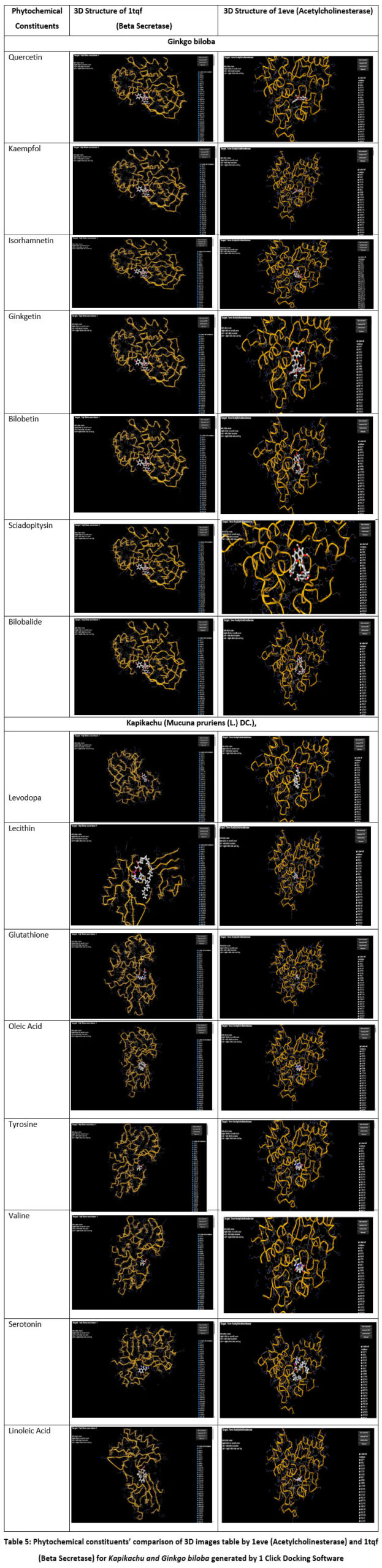 Table 5: Phytochemical constituents’ comparison of 3D images table by 1eve (Acetylcholinesterase) and 1tqf (Beta Secretase) for Kapikachu and Ginkgo biloba generated by 1 Click Docking Software