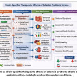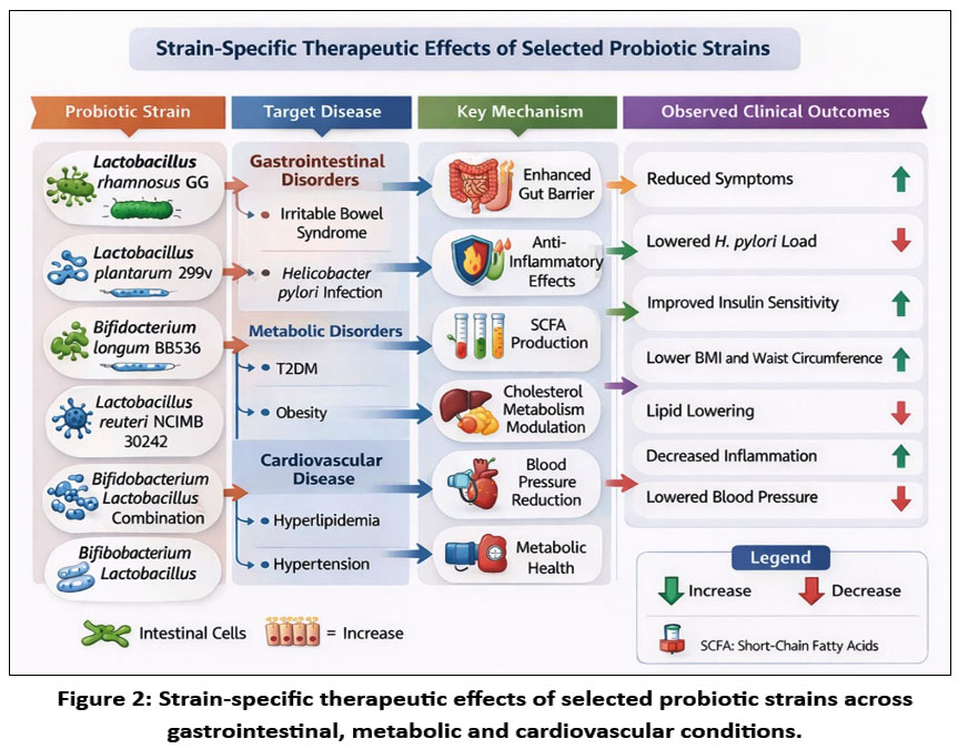 Figure 2: Strain-specific therapeutic effects of selected probiotic strains across gastrointestinal, metabolic and cardiovascular conditions.
