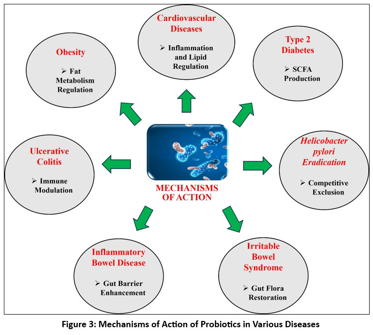 Figure 3: Mechanisms of Action of Probiotics in Various Diseases
