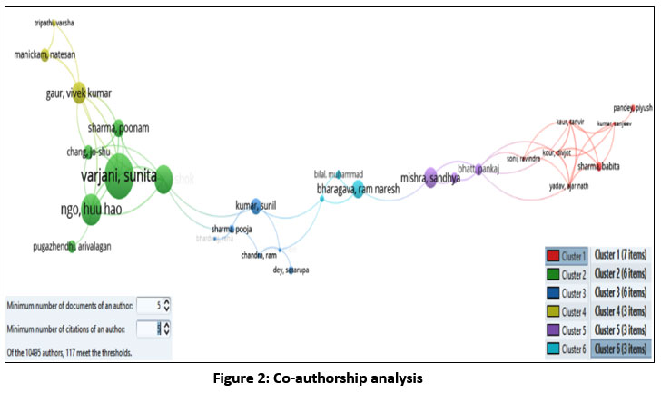 Environmental Science leads with 1692 publications, followed by Biological Science with 1679 publications. Microbiology has 1009 publications, Pollution and Contamination has 880 publications, and Engineering has 846 publications. Other fields are Agricultural, Veterinary and food science, Chemical Engineering, Environmental Biotechnology and Industrial Biotechnology.35 The coauthorship analysis represented in the Fig.2. The analysis of co-authorship by country represented in Table 2 and Fig.3 demonstrates India’s leading position with 821 documents and 26661 citations, showcasing a strong international collaboration and impact. Following India, China has 581 documents and 18875 citations, emphasizing its significant research contribution. The United States ranks third with 132 documents and 5901 citations, highlighting its active involvement in global research networks.36 Noteworthy countries like Saudi Arabia, Pakistan, and South Korea also show substantial participation in research activities, as indicated by their document numbers and citations.37
