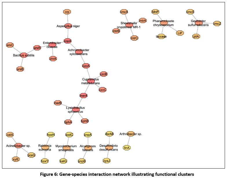 In the network analysis using Cytoscape followed by NCBI represented in Fig.6, the constructed gene-species interaction network revealed a clear modular structure comprising four major functional clusters linked to heavy metal detoxification, electron transfer, aromatic compound degradation, and ancillary metabolic pathways. The heavy metal detoxification module was the largest and most interconnected, centred on the hub gene copA and linked to key metal-resistance genes such as arsB, arsC, czcC, merA, and chrA. This cluster also included several metal-tolerant microbes, Bacillus subtilis, Achromobacter xylosoxidans, Cupriavidus metallidurans, Enterobacter cloacae, and particularly Lysinibacillus sphaericus highlighting its functional dominance in metal-stressed environments.45
